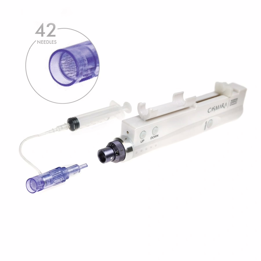 Casmara's microneedling opzetstukken zijn speciaal ontwikkeld voor de Activator Pen. Het opzetstuk bevat 42 naalden - het actieve ingrediënt wordt gecontroleerd via een doseerbuisje op het apparaat door het naaldopzetstuk aangebracht en direct via de naalden in de huid gewerkt. Dit betekent dat er geen druppel product verloren gaat en dat je comfortabel met één hand kunt werken zonder dat je de serums met actieve ingrediënten handmatig hoeft aan te brengen.