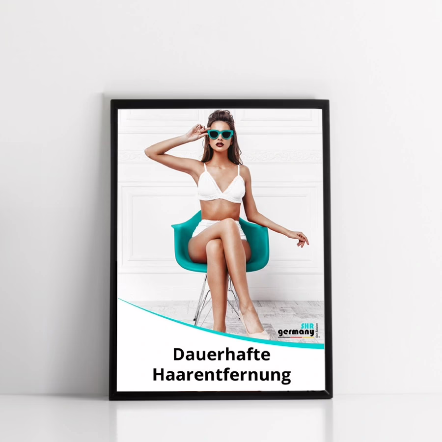 Gebruik het interieur en exterieur van je studio om reclame te maken voor je diensten. De hoogwaardige reclameposter in glanzende kwaliteitsbedrukking op 250 g papier is duurzaam en gemakkelijk te bevestigen met afmetingen van 60 x 80 cm - of het nu op de muren, in de etalage of op een klantenstopper voor uw salon is. Je vindt ook een bijbehorende reclamestandaard en alles wat je nodig hebt voor succesvolle permanente ontharingsbehandelingen in onze SHR Germany online shop - de marktleider op het gebied van apparatieve cosmetica!