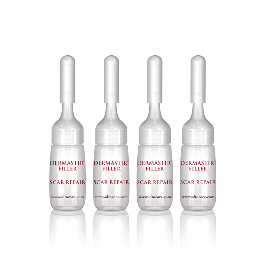Een doosje Dermastir Post Filler Scar Repair bevat 4 hersluitbare ampullen van elk 4 ml.