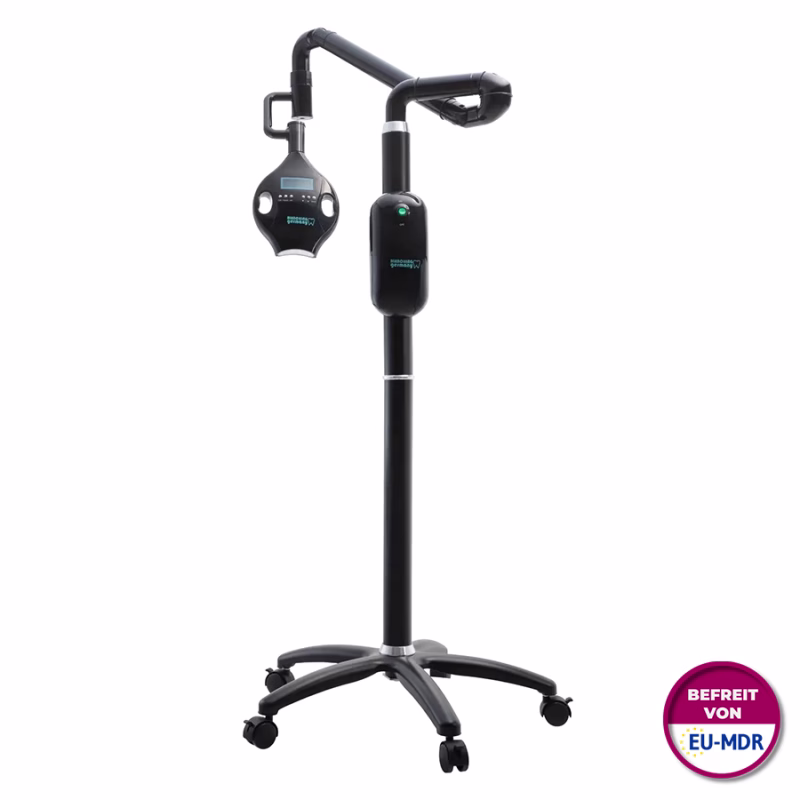 De tandbleeklamp is uiterst eenvoudig te bedienen. De behandelingstijd en de instellingen voor de lichtkleur (rood, blauw, violet) en intensiteit (40-100%) worden aangepast met één druk op de knop op de lampkop. Zodra de geselecteerde behandeltijd is verstreken, schakelt het tandbleeksysteem het licht automatisch uit.