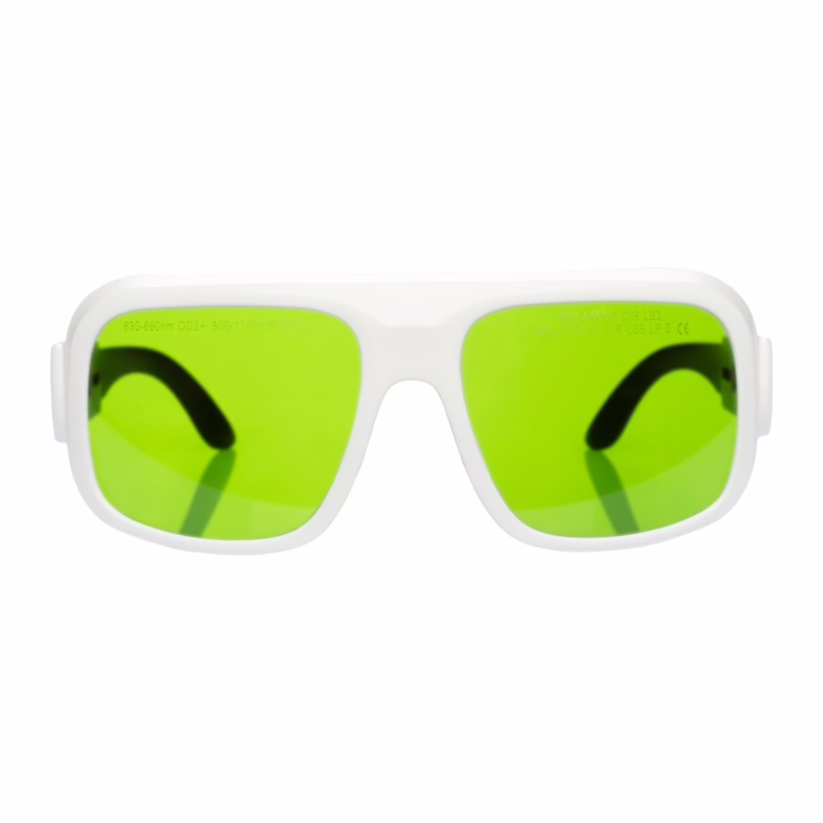 De groen getinte lenzen filteren het risicovolle licht van zowel diodelasers als Nd:YAG-lasers. Dit betekent dat je de veiligheidsbril voor meerdere behandelingen kunt gebruiken. Zorg er alleen voor dat de laserstralen zich in het bereik tussen 630-660 en 800-1100 nanometer bevinden. De bril biedt geen bescherming bij andere golflengten!