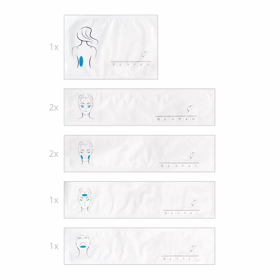 Het dunne, flexibele materiaal vormt zich naar de natuurlijke contouren van de desbetreffende klant en is zelfklevend aan één kant voor optimaal huidcontact. De liftende en verjongende EMS- en radiofrequentie-energieën worden diep in het betreffende toepassingsgebied geleid om hun doelgerichte effect te ontwikkelen.