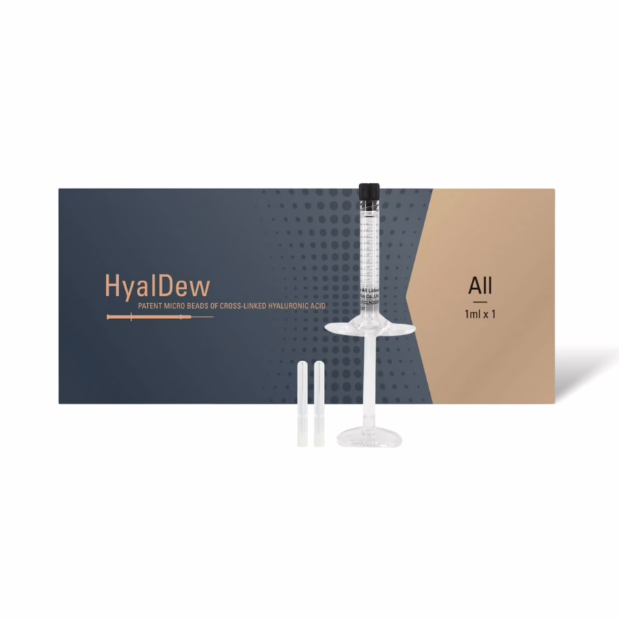 HyalDew All is de hardste gel in de productlijn. Door de kleinere deeltjesgrootte is makkelijk aan te brengen op elk deel van het gezicht. Dit verstevigt de huid en verstevigt de contouren van het voorhoofd, de slapen, de neus, de wangen, de lippen en de kin. Diepe rimpels, zoals de nasolabiale plooi, worden verminderd. Bovendien kan HyalDew All niet alleen het volume van de huid herstellen, maar heeft het ook antiverouderingseigenschappen. Het is een van de weinige fillers die geschikt is voor zowel facial contouring als dynamische rimpelcorrectie. Dankzij de flexibele structuur past de hyalurongel zich aan de bewegingen van het gezicht aan. Dankzij deze eigenschap kan deze filler de zichtbaarheid van expressierimpels, zoals voorhoofdsrimpels, verminderen.