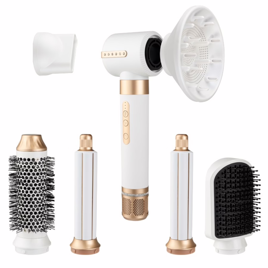 Het uiterlijk van de haarstyler is top modern en chic. Het witte design met roségouden accenten en fonkelende edelstenen geven de veelzijdige haardroger een luxe uitstraling. Hij is ook gemakkelijk te gebruiken en wordt geleverd met een warmtebeschermingshandschoen om te beschermen tegen brandwonden bij het verwisselen van het opzetstuk.
