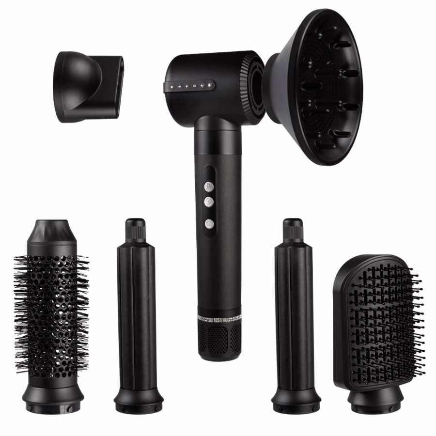 Met dit hoogwaardige apparaat in elegant zwart en met fonkelende edelstenen krijg je niet alleen een krachtige haardroger. In totaal zitten er 7 opzetstukken voor verschillende stijlen in deze set, evenals twee krultangen met de populaire Airwrap technologie!De haarstyler biedt ook drie temperatuur- en drie snelheidsinstellingen, zodat je elk haartype vakkundig kunt stylen.
