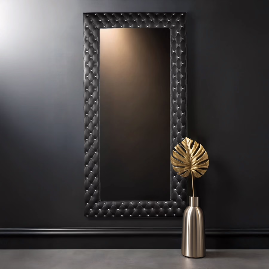 De spiegel over de volle lengte met stijlvolle PVC leren bekleding en opvallend kristallen decor is een echte blikvanger en verfraait elk interieur. Het frame is gemaakt van een duurzame melaminehars plaat, is robuust en uitstekend afgewerkt.