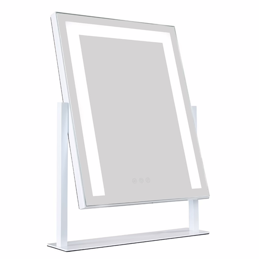 Dankzij de ideale afmetingen van 41 x 50 cm past de spiegel ook op kleine en smalle planken zoals dressoirs, kaptafels en legplanken. Bijzonder praktisch: het spiegeloppervlak kan worden gekanteld, zodat je heel dichtbij kunt kijken. Dankzij het hoogwaardige spiegelglas kan make-up heel precies worden aangebracht en worden alle details weergegeven. Dankzij de keuze aan lichtkleuren en de mogelijkheid om de spiegel te kantelen, kun je de stijl en het effect op speelse wijze controleren bij daglicht en avondlicht. De elegante voet van zilverkleurig roestvrij staal zorgt voor extra stabiliteit.