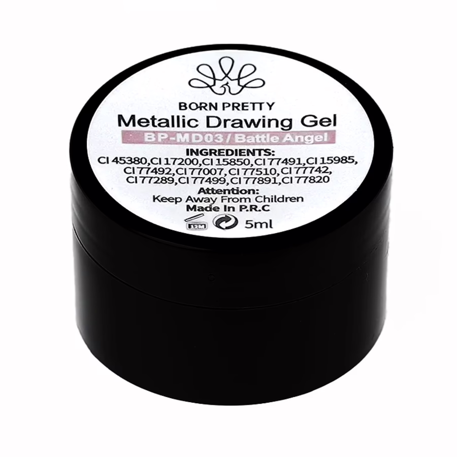De Metallic Drawing Gel Battle Angel van Born Pretty is daarop geen uitzondering: duizenden rosékleurige glitterdeeltjes geven de nagels warme elegantie en vrouwelijkheid en trekken gegarandeerd de aandacht naar de handen.
