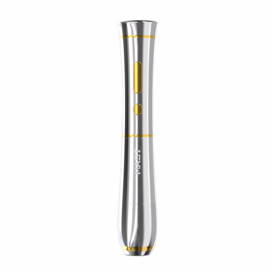 De handige tatoeage pen kan niet alleen moeiteloos tatoeëren. Hij maakt ook indruk met zijn hoogwaardige en moderne design - een glanzend mat zilverkleurig oppervlak gecombineerd met subtiele elementen in helder geelgoud. Een droom voor elke designliefhebber!