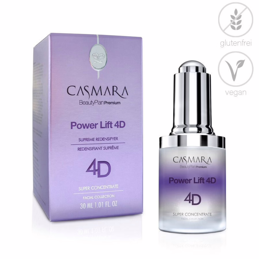 Trakteer je huid op een buitengewone verjongende behandeling. Casmara Concentrate Power Lift 4D is een zeer effectief serum tegen de tekenen van veroudering. Het bestrijdt gezichtsverslapping, rimpels (zowel opkomende als bestaande) en helpt bij een gebrek aan volume. Power Lift 4D met 4D TECHNOLOGY (hyaluronzuur met 4 verschillende molecuulgewichten), gefermenteerde shiunko olie en bio-intelligente peptiden, werkt direct in op de belangrijkste elementen van de extracellulaire matrix (ECM), verstevigt en verstevigt de huid en voorziet deze van langdurig vocht. Dankzij de unieke combinatie van natuurlijke, voedende actieve ingrediënten wordt het serum gemakkelijk geabsorbeerd en vult het specifiek je dagelijkse huidverzorgingsregime aan. Het serum is vrij van siliconen en minerale oliën en is bovendien veganistisch en glutenvrij.
