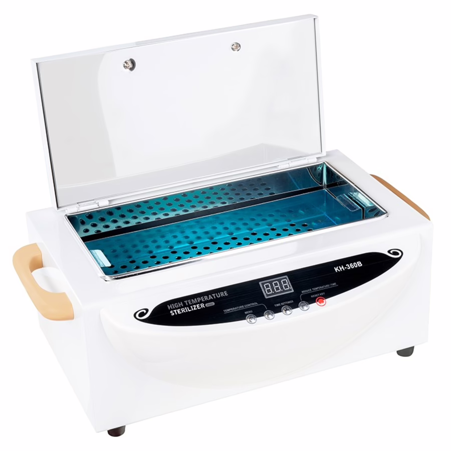 Kiemvrij met hitte - de SHR Germany heteluchtsterilisator maakt het mogelijk! Bij een temperatuur tot 250 graden Celsius worden bacteriën en virussen effectief verwijderd van kappersscharen, pincetten, manicure- en pedicure-instrumenten en nog veel meer. Kleinere voorwerpen kunnen tijdens het proces worden opgeborgen op de verwijderbare lade in de sterilisator. De sterilisator kan gemakkelijk worden verplaatst dankzij de handgrepen aan de zijkant. De rubberen voetjes voorkomen dat de sterilisator wegglijdt op gladde oppervlakken. De sterilisator is eenvoudig te bedienen dankzij de knoppen. Hij kan op verschillende manieren worden gebruikt in schoonheids- en nagelsalons, dokterspraktijken of kapsalons.