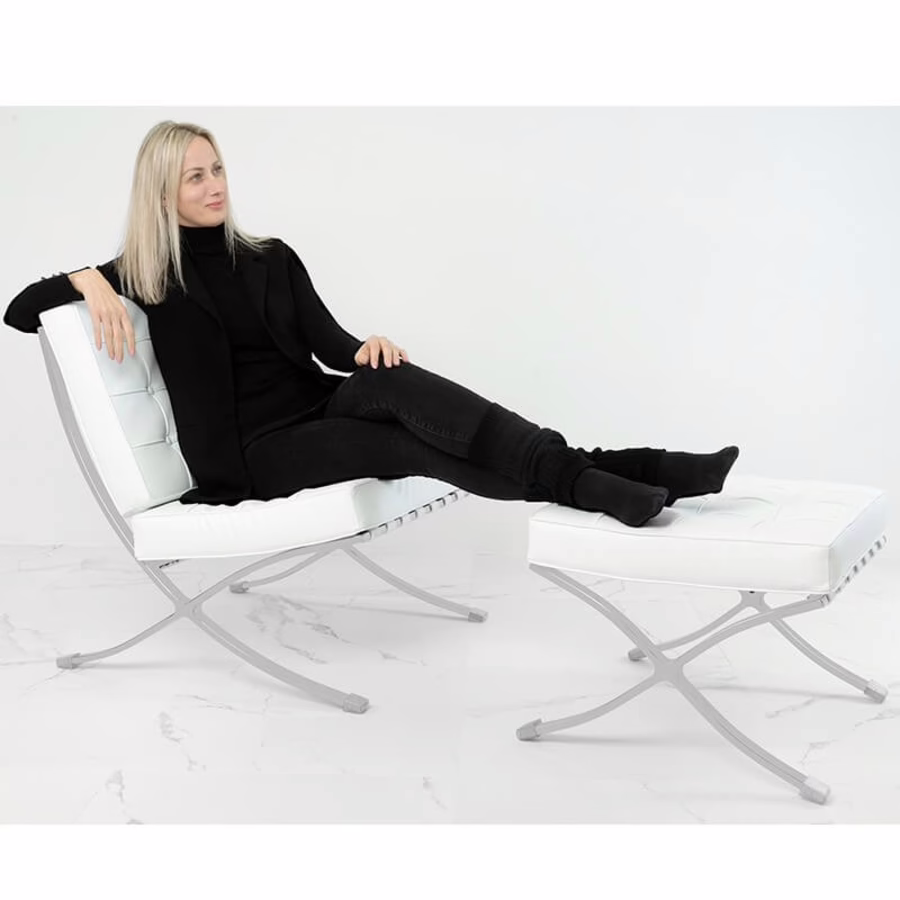 Een droom in wit - de Barcelona Chair design fauteuil en kruk geven uw privé- of bedrijfsruimte een tijdloze flair.