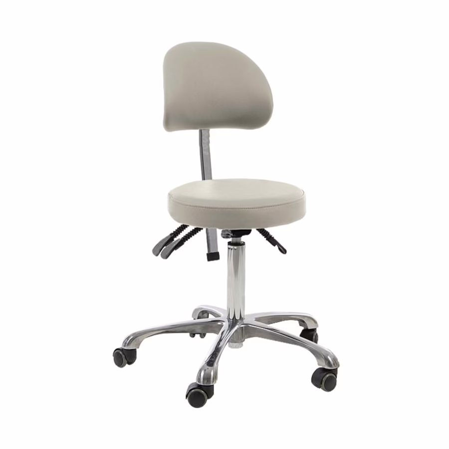 De bureaustoel in elegant wit is ideaal voor het werken in schoonheidssalons, praktijken en kuuroorden. Dankzij de gestoffeerde rugleuning bevordert hij bovendien een gezonde zithouding en is hij goed voor de rug. De stoel is uitgerust met 5 wielen op een chromen stervoet, zodat je de stoel snel en stil heen en weer kunt laten glijden zonder je werkstroom te onderbreken.