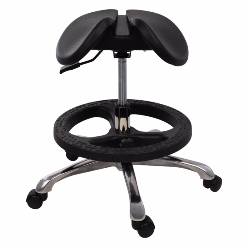 Bij het werken in kappers- en schoonheidssalons en in nagel- en tatoeagestudio's moet je lange tijd zitten. Dit kan leiden tot rugklachten. Het ergonomische ontwerp van de zadelkruk verbetert automatisch de houding, verdeelt het lichaamsgewicht gelijkmatig over de gedeelde zitting en verlicht of voorkomt zo rugpijn.