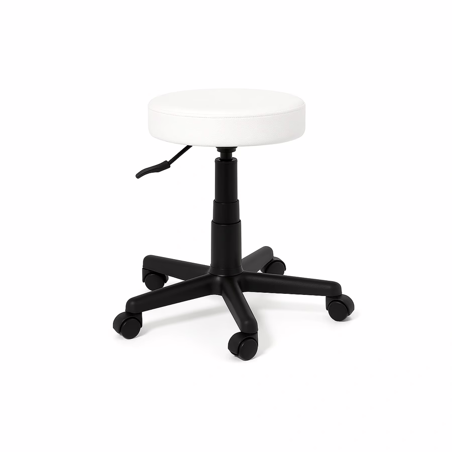 De rolkruk heeft een eenvoudig maar stijlvol ontwerp. De zitting is bekleed met kunstleer van hoge kwaliteit in wit - dus hij past gemakkelijk in elke behandelkamer.