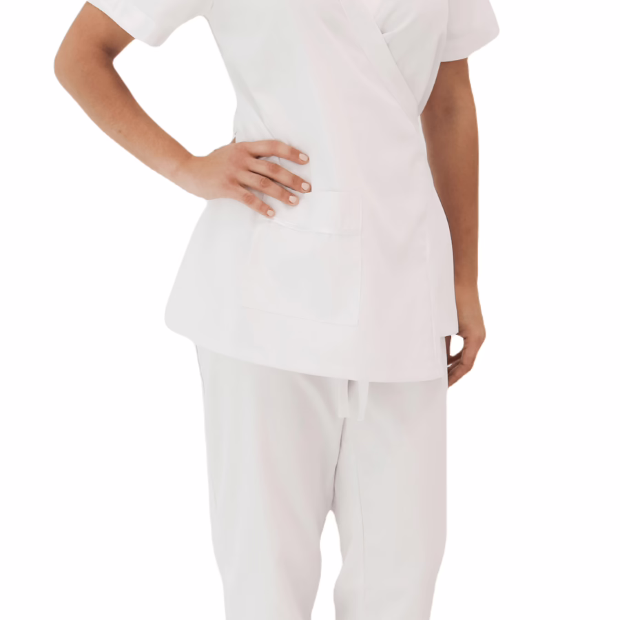 Op de top staat de zwarte belettering van het Spaanse luxemerk Casmara. De tuniek is omwikkeld met lange linten en wordt op de rug of aan de zijkant gestrikt. Het vrouwelijke, heuplange wikkeljasje is aangenaam gemakkelijk te dragen - nauwsluitend of helemaal onconventioneel en daarom losjes gestrikt. De witte werkbroek, die ondanks de elegante, rechte snit veel bewegingsvrijheid biedt, past perfect bij de top. Dankzij het elastische trekkoord en de geïntegreerde tailleband kan de taillewijdte van de broek eenvoudig worden aangepast. Net als de top is ook de broek comfortabel om te dragen. Beide zijn gemaakt van een gemakkelijk te onderhouden materiaal van 70% polyester en 30% katoen dat wasbaar is op 40 graden.