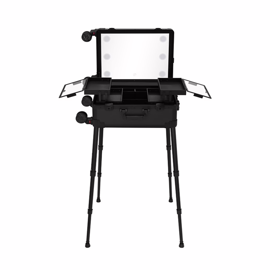 Eenmaal aangekomen op je werkplek kun je de koffer eenvoudig opzetten met de uitschuifbare poten. De hoogte kan worden aangepast zodat je comfortabel kunt werken.