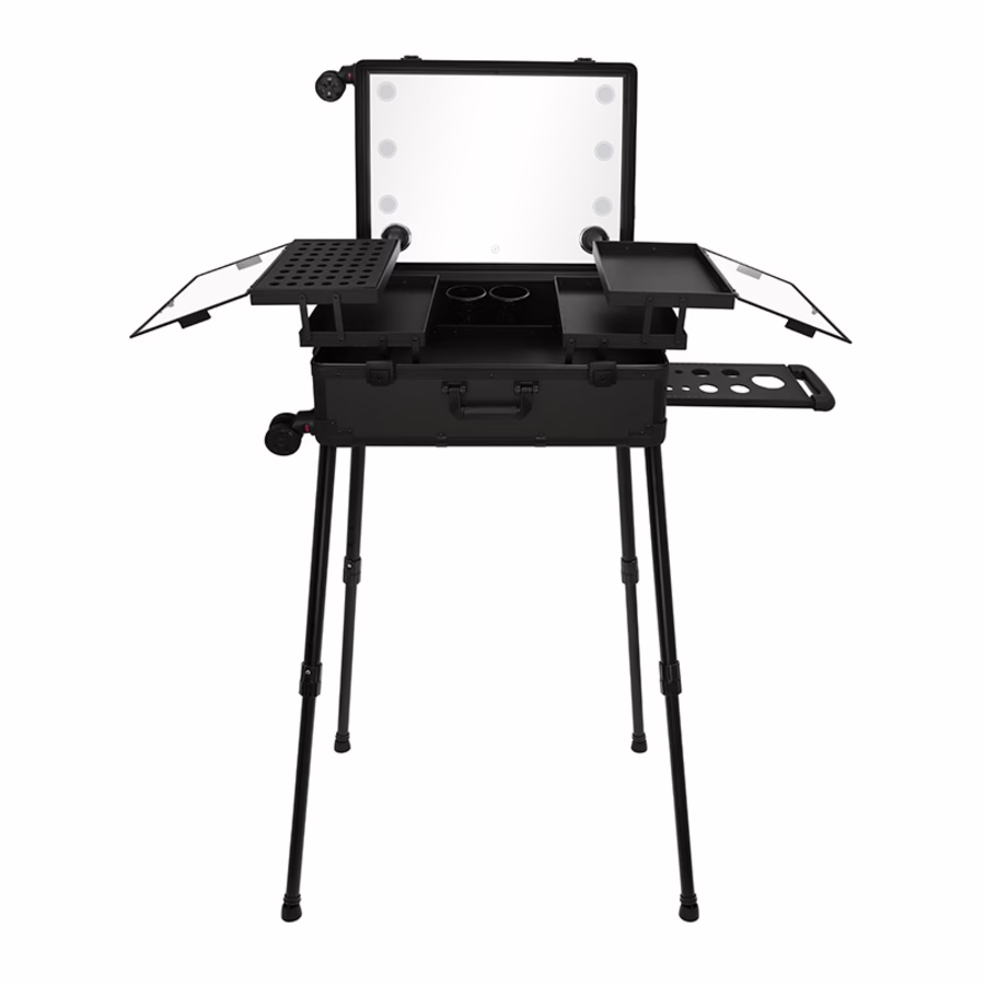 Deze koffer heeft veel te bieden, en dan hebben we het niet alleen over de afsluitbare opbergruimte of de elegante zwarte look. Uitgerust met een grote spiegel en de zes geïntegreerde touchscreen-gestuurde lampen zorgt hij voor een goed overzicht.