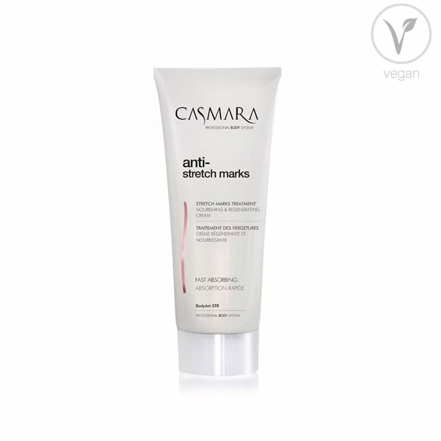 De Casmara Anti-Stretch Marks Cream heeft een speciale formule voor het behandelen van bestaande striae op de huid. Bij regelmatig gebruik voorkomt het ook de vorming van verdere zichtbare striae op het bindweefsel. De veganistische crème is ook geschikt als anti-cellulitisbehandeling en bevordert vetvermindering. In dit product zijn drie zeer effectieve ingrediënten gecombineerd: REGESTRIL® is een bijzonder goed te verdragen product dat speciaal is samengesteld om striae te verminderen en de huid te revitaliseren en te verstevigen.