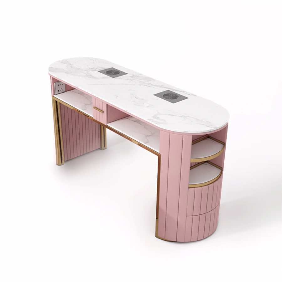 Hou je van een speels design maar wil je toch professionele functionaliteit? Dan is deze manicuretafel de absolute must-have voor je nagelsalon! Met zijn charmante combinatie van zachtroze kunstleer, wit gemarmerde oppervlakken en glanzend goud brengt hij niet alleen glamour en elegantie in elke ruimte, maar zorgt hij ook voor optimale werkomstandigheden.