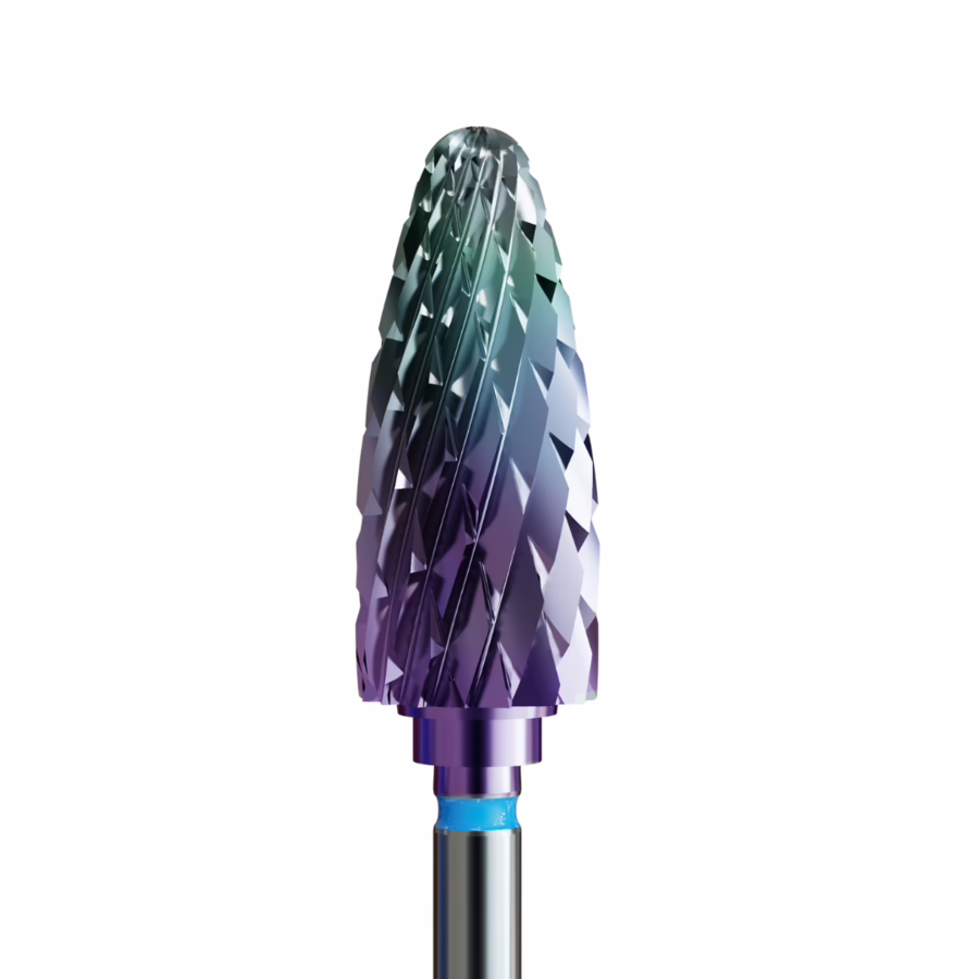 Snel frezen van kunstnagels met vele voordelen en een praktische kameleon coating: het vlamvormige hardmetalen freeshulpstuk met standaard kruisvertanding (KMN-247X HP 060) van IQ Nails!