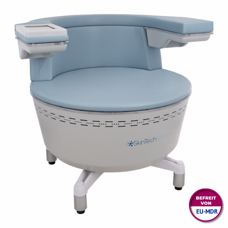 Naast de onovertroffen werking maakt de SkinTechBeauty EMS PelviChair XS Pro ook indruk met zijn design. De moderne fauteuil-look is een echte blikvanger. De hoogtepunten zijn de LED-strips op de zitting en armleuningen. Het zachte, blauwe licht zorgt voor een gezellige sfeer en past perfect bij de hemelsblauwe bekleding.