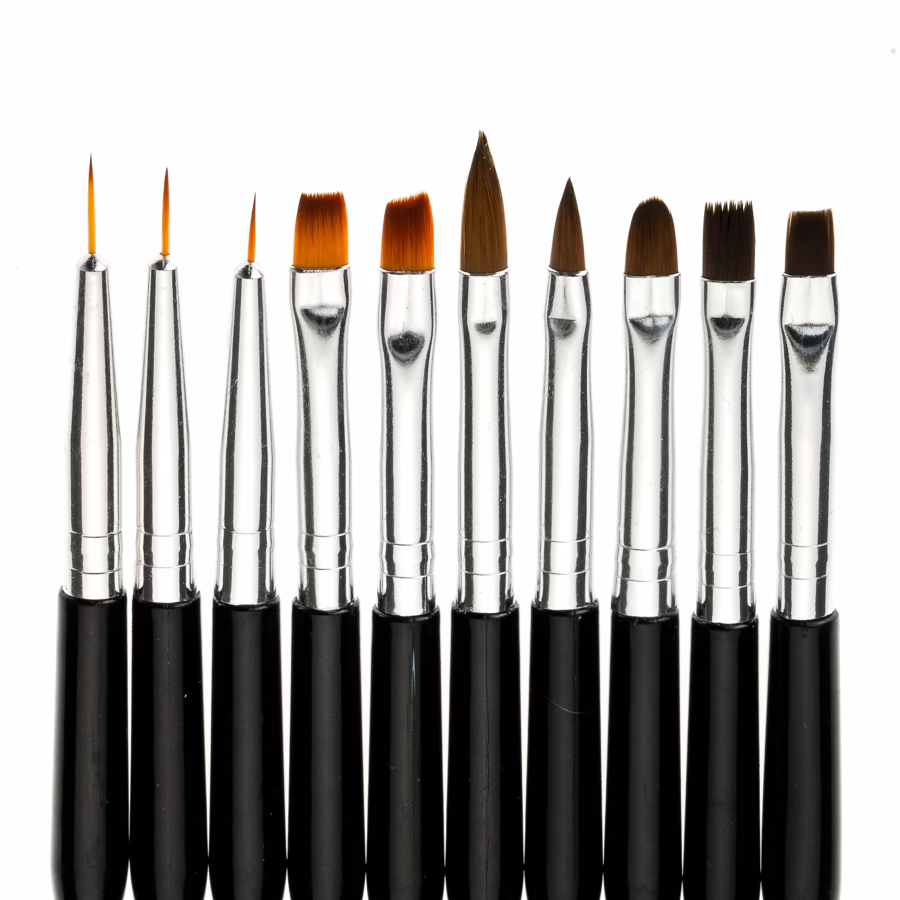 De set bestaat uit 10 hoogwaardige nail art penselen. Elk van hen heeft een speciale borstelkop en is daarom ideaal voor een andere nail art taak. Drie penselen hebben een platte tip, één met een afgeschuinde tip, één met een afgeronde tip, twee met een taps toelopende tip en drie met een ultrafijne tip. Dit betekent dat je perfect bent uitgerust om bloemen, dieren of vormen op je nagels te tekenen, adembenemende blendingeffecten te bereiken, vorm te modelleren of nagelgel vlekkeloos aan te brengen.