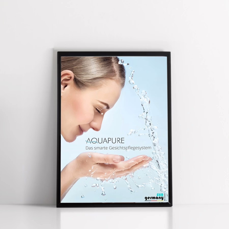 Kleine moeite, groot effect: Versier je studio met de Aquapure-reclameposter en vestig de aandacht van je klanten op de fantastische behandelmogelijkheden voor dieptereiniging en verjonging van de huid.