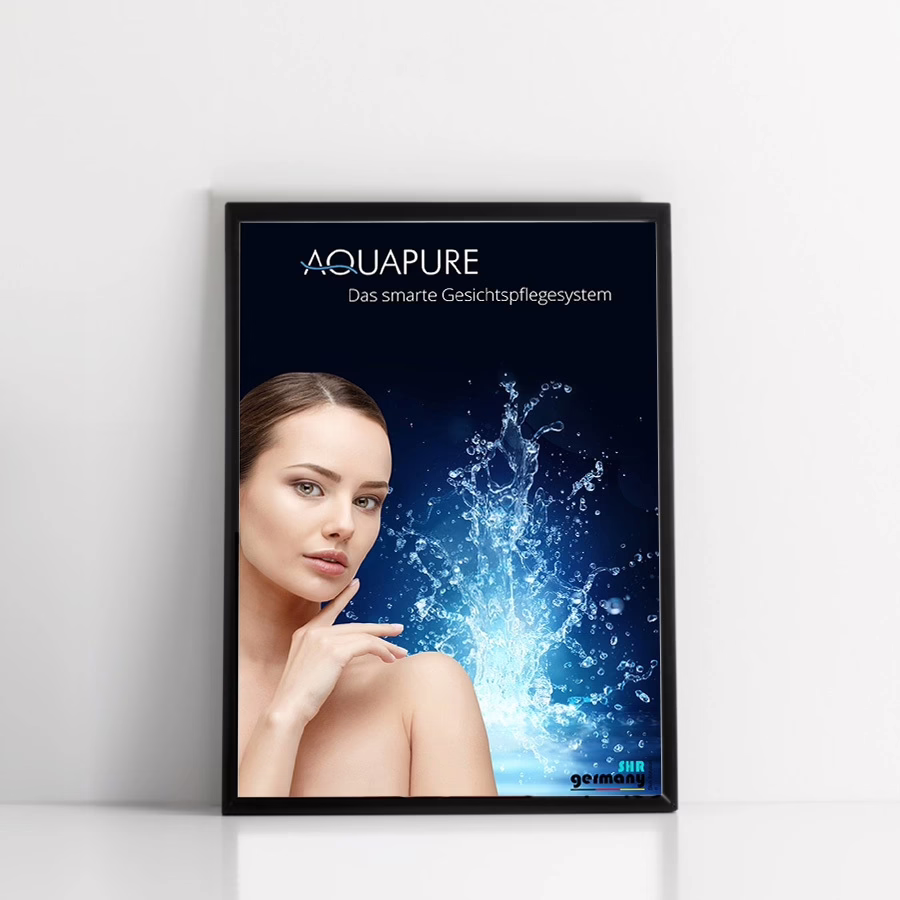 Wie adverteert, wint! Profiteer van het effect van kosteneffectieve reclamemiddelen zoals de SHR Germany poster voor behandelingen met het Aquapure apparaat van de Duitse marktleider.Het aansprekende motief in sterke, verfrissende kleuren trekt ieders aandacht en wekt de interesse van uw klanten voor een behandeling voor dieptereiniging en verjonging van de huid direct in uw salon!