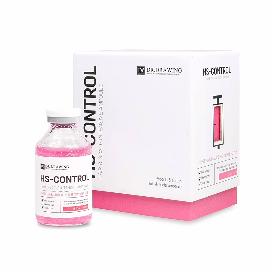 De HS-Control ampul is perfect om de haargroei te stimuleren. Hoogwaardige ingrediënten zoals Acorus calamuswortelextract en biotine voeden de hoofdhuid, verminderen jeuk en versterken de haarwortels. De beschadigde huid ziet er niet alleen uitgeruster uit, maar ook levendiger. De lichte textuur wordt snel opgenomen in de diepere lagen van de huid. Het injecteren van de ampul in de huid bevordert de ontwikkeling van de ingrediënten, omdat ze veel beter kunnen doordringen in de diepere lagen van de huid. Daarom is de HS-Control ampul van Dr. Drawing ideaal voor microneedling behandelingen.