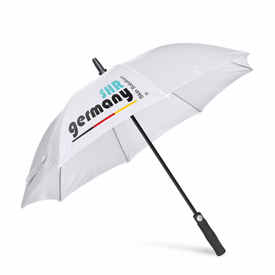 Bewapend voor elke regenbui! De SHR paraplu in wit is de perfecte compagnon voor het dagelijks leven. De hoogwaardige afwerking van de SHR paraplu laat niets te wensen over. De witte kleur ziet er goed uit en kan perfect gecombineerd worden met elke kledingstijl. Dankzij de compacte afmetingen en het lichte gewicht past de SHR-paraplu in elke tas of rugzak, waardoor hij heel gemakkelijk mee te nemen is.
