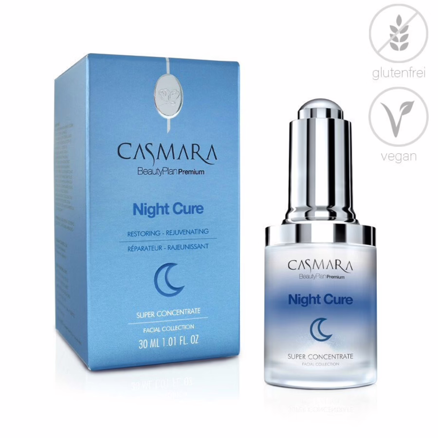 Voor het perfecte schoonheidsslaapje en een ontspannen ochtend! Verwen je huid met Casmara's superserum en laat het 's nachts voor je werken. De Concentrate Night Cure is samengesteld uit verschillende glutenvrije en veganistische actieve ingrediënten die een verbluffend anti-aging effect hebben. Centella Asiatica, wild mos extract en jojoba melk bevorderen de vorming van collageen en elastine. De huid regenereert en wordt rijkelijk voorzien van vocht. Het natuurlijke plantencelcomplex OvernightEnhance [MJ+C] stimuleert de stofwisseling van de huidcellen, vermindert rimpels en heeft een ontgiftende werking. Als het serum 's avonds wordt aangebracht, ontvouwt het 's nachts zijn volle effect en heb je 's ochtends een aanzienlijk verjongde, stralende teint. Het is geschikt voor alle huidtypes - vooral voor de rijpere huid met de eerste tekenen van veroudering.