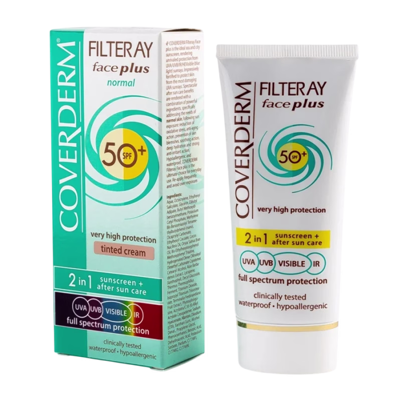 Coverderm Filteray Face Plus Normal Getinte SPF 50+ is 100% waterproof en biedt langdurige bescherming.