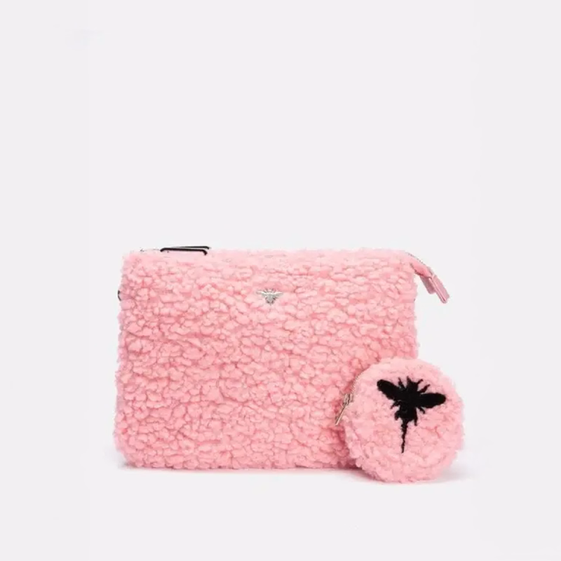 Modieus, gezellig, functioneel: de teddy crossbodytas in roze combineert speelse texturen met een moderne statement look.