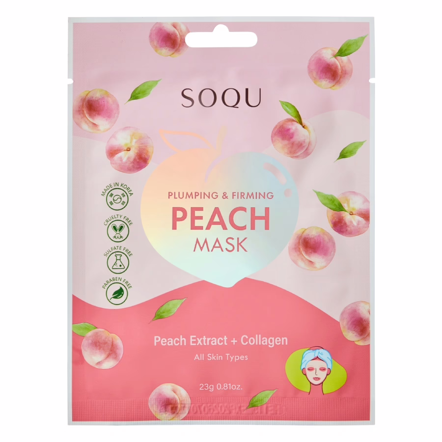 Zompig fruitplezier voor je teint: het Soqu Plumping and Firming Peach Mask verwent de huid met rijke perzikessentie en maakt haar hemelszacht.