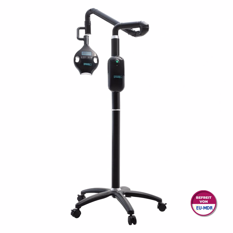 De tandbleeklamp is uiterst eenvoudig te bedienen. De behandelingstijd en de instellingen voor de lichtkleur (rood, blauw, violet) en intensiteit (40-100%) worden aangepast met één druk op de knop op de lampkop. Zodra de geselecteerde behandeltijd is verstreken, schakelt het tandbleeksysteem het licht automatisch uit.